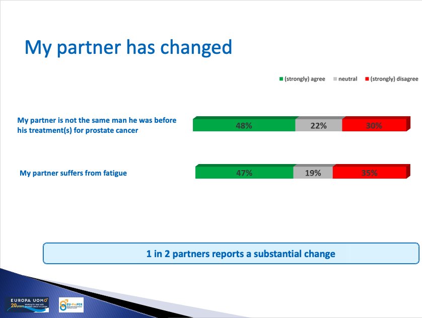 The results show that prostate cancer brings a significant effect on couples – their relationship, intimacy, social life and mental health. Partners perceive significant impacts of the cancer and its treatments. Half say their partner suffers from fatigue.
